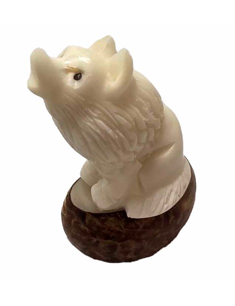 Loup taillé dans la graine de tagua appelée aussi ivoire végétal ou corozo.